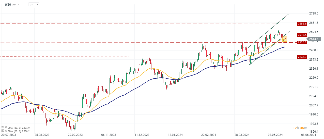 Na wykresie w interwale 1-dniowym kontrakt na indeks WIG20 (W20) przebił w trakcie piątkowej sesji korytarz trendu wzrostowego trwający od połowy kwietnia. Mimo to spadki zatrzymały się na linii wsparcia na poziomie 2520,2 pkt, którą wyznaczają szczyty z lutego i marca. Tym samym możemy wnioskować o potencjalnym utrzymaniu się tendencji wzrostowych i przy udanym przebiciu poziomu 2550 pkt. spodziewać się powrotów do kanału wzrostowego. Jeżeli jednak nie uda się to kontraktowi inwestorzy powinni obserwować poziom 2520 pkt., którego przebicie utrzymanie notowań poniżej niego może spowodować powrót do trendu bocznego widocznego w 1 kwartale tego roku. Źródło: xStation