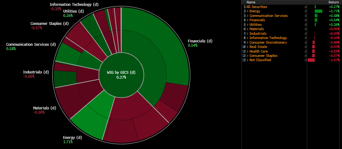 Po mocnych odbiciach z piątkowej sesji na amerykańskiej giełdzie polski rynek rozpoczyna tydzień w pozytywnych nastrojach. Szeroki indeks WIG zyskuje dziś 0,27%. Najwyższe wzrosty notują dziś energetyka (+1,71%), usługi telekomunikacyjne (+0,58%) oraz sektor finansowy (+0,54%). Wzrosty w sektorze finansowym prowadzą przede wszystkim banki, których indeks WIG-Banki rośnie dziś o ponad 0,8%. Straty widzimy natomiast w sektorze dóbr konsumpcyjnych (-0,57%).