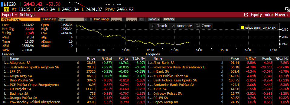 Polski rynek notuje dziś mocne przeceny. WIG traci ponad 2%, WIG20 spada o 2,13%, mWIG40 o prawie 1,7%, a sWIG80 o 0,74%. Wśród sektorów najgorzej radzi sobie sektor bankowy. WIG-Banki traci dziś ponad -4,17%. Liderami spadków są Alior Bank (-5,5%), PKO (-4,78%) oraz mBank (-4,34%).