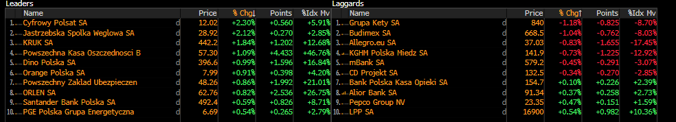 W głównym indeksie najlepiej radzi sobie Cyfrowy Polsat z 2,3% wzrostem oraz JSW, która zyskuje dziś ponad 2%. Wykres spółki dalej pozostaje w ograniczeniach długoterminowego trendu spadkowego, a napływające w tym tygodniu informacje odnośnie problemów spółki z górnikami prowadzącymi do potencjalnych strajków nie rysuje przed nią najlepszych perspektyw.