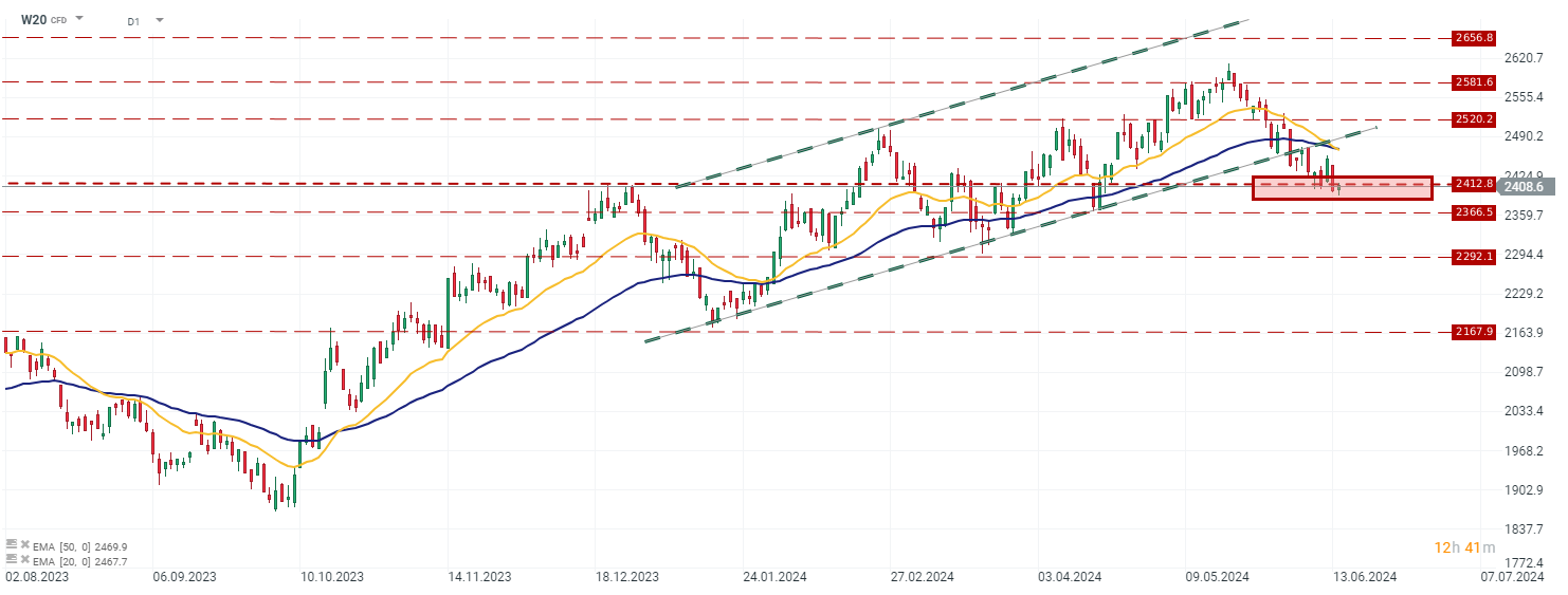 Ten tydzień przyniósł utrwalenie dolnego przebicia kanału trendu wzrostowego, który widzieliśmy na kontrakcie na WIG20 (W20) od początku tego roku. Kontrakt powrócił do wartości z końcówki kwietnia, całkowicie niwelując majowe zyski. Teraz notowania walczą o utrzymanie się w kanale między 2412 pkt. a 2520 pkt. Przebicie wsparcia może sugerować dalsze spadki w granice 2366,5 pkt. Dodatkowym sygnałem dla niedźwiedzi może być przecięcie się wykładniczych średnich kroczących (EMA20 i EMA50). Źródło: xStation