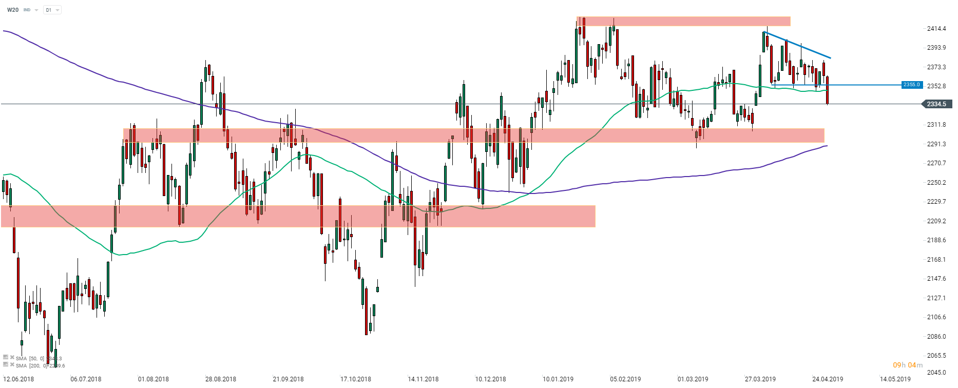 Indeks W20 (instrument oparty o notowania kontraktów na WIG20) przebił się dziś poniżej formacji trójkąta wyznaczonej przez krótkoterminową linię trendu spadkowego oraz 50-sesyjną średnią kroczącą. Opuszczenie zasięgu formacji otworzyło niedźwiedziom drogę do strefy wsparcia rozciągającej się wokół poziomu 2300 pkt. Źródło: xStation5