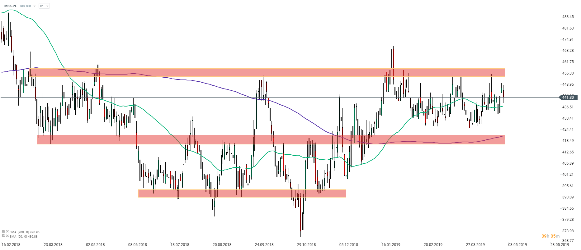Pomimo lepszych wyników kurs akcji mBanku traci dziś ze względu na potencjalne problemy mogące odbić się na cały polskim sektorze bankowym. Cena pozostaje pomiędzy dwoma ważnym strefami technicznymi i jest szansa, że na tym w najbliższym czasie będzie utrzymywał się trend boczny. Źródło: xStation5