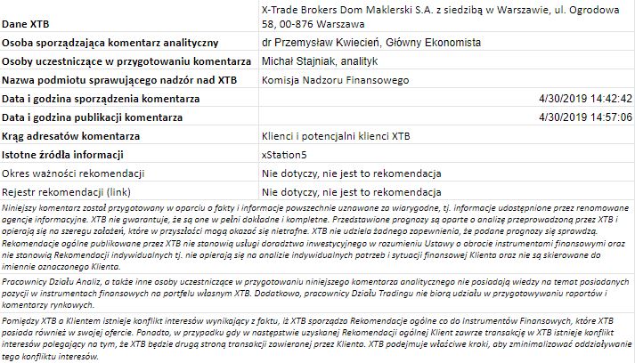 Dziś w centrum uwagi jest między innymi mBank (MBK.PL) i Santander (SPL.PL). Oba bank opublikowały raporty wyników za I kw. 2019 roku i w obu przypadkach przychody okazały się wyższe od oczekiwań rynkowych. Ponadto, w przypadku mBanku mieliśmy również do czynienia z zyskiem na akcję, który był wyższy od oczekiwań o prawie 16% (3,71 PLN vs 3,20 PLN). W przypadku Santandera zysk na akcję na poziomie 3,43 PLN był około 5% niższy od rynkowego konsensusu. Niemniej jednak, pomimo tych względnie dobrych wyników akcje obu spółek notowane są dziś niżej. Powodem może być sytuacja innego polskiego banku.