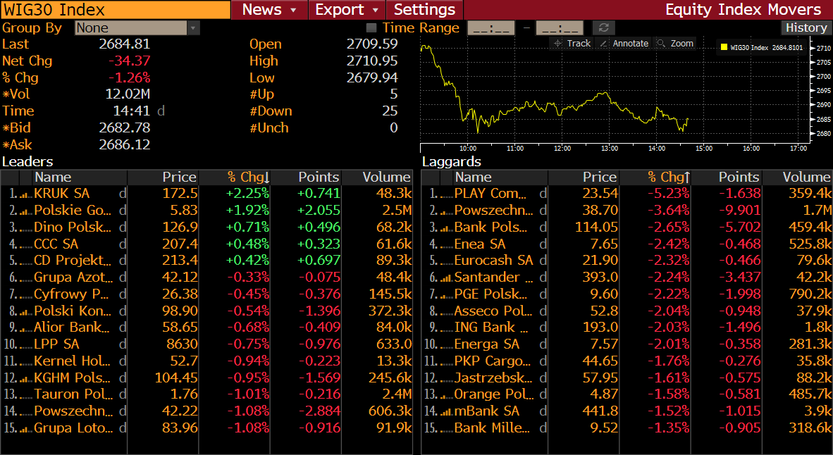 Spółki z indeksu WIG30 o godzinie 14:41. Źródło: Bloomberg