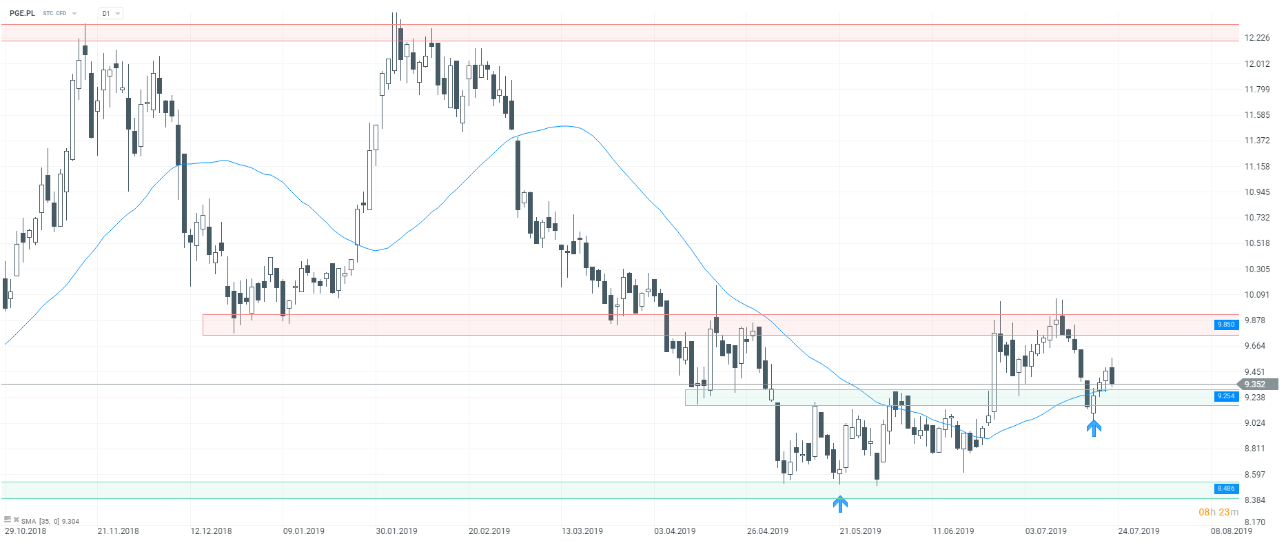 PGE niweluje wczorajsze wzrosty, strefa przy 9,25 zł kluczowym wsparciem. Źródło xStation5