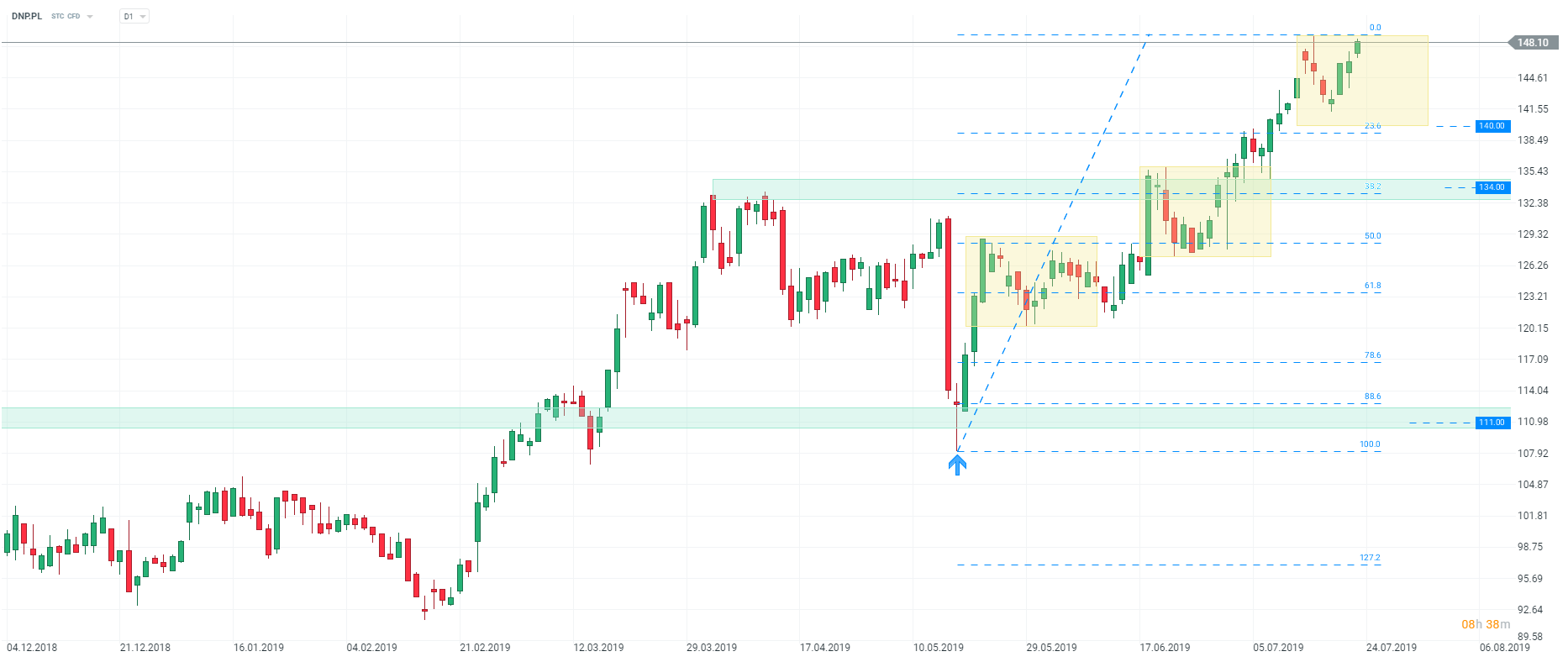 We wtorek DM BOŚ wydał rekomendację dotyczącą spółki Dino Polska. Została ona obniżona z"trzymaj" do "sprzedaj".Jednak jak widać po wykresie, inwestorzy nie przejmują się gorszą rekomendacja od BOŚ. W ostanich dniach utrzymuje się pozytywny sentyment. Kurs rośnie podczas wtorkowej sesji ponad 1,2%. Aby myśleć o większej korekcie spadkowej, cena musiałaby pokonać dolne ograniczenie lokalnego układu 1:1 - żółte prostokąty. Niemniej nawet takie zejście, nie oznaczałoby zmiany trendu, kolejnym istotnym wsparciem jest strefa przy 134, zł, gdzie wypada zniesienie 38,2% oraz ostatnie szczyty.