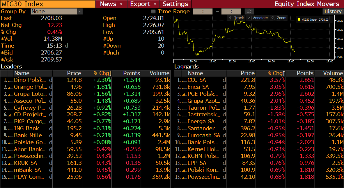 W środę wśród dużych polskich spółek dominują spadki. Źródło: Bloomberg