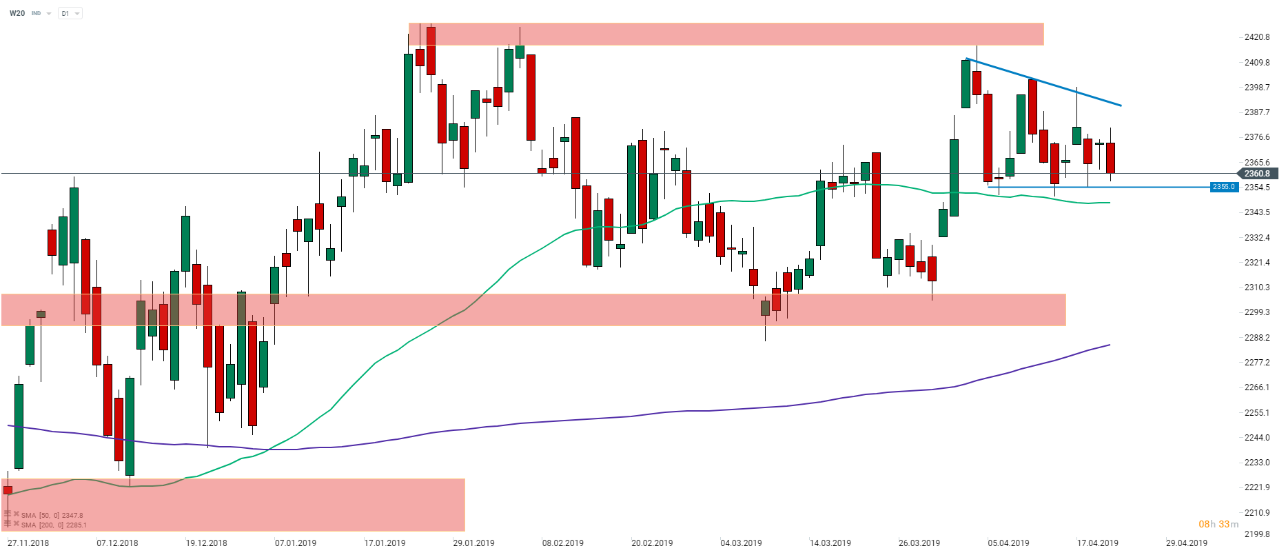 Sytuacja na wykresie indeksu WIG20 (W20) nie ulega zmianie w tym tygodniu. Cena wciąż wydaje się poruszać między linią trendu spadkowego, a 50-sesyjną średnią kroczącą (zielona linia). Ostatnia akcja cenowa sugeruje jednak, że poziom 2355 pkt może bardziej dokładnie wskazywać dolne ograniczenia zakresu ruchów. W rezultacie można stwierdzić, że W20 porusza się w formacji trójkąta spadkowego, która w teorii zwiastuje spadki. Źródło: xStation5