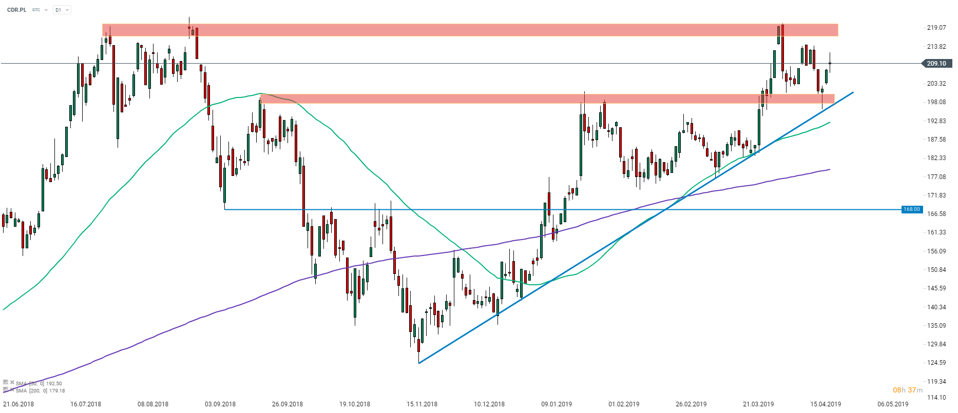 Druga połowa 2018 roku nie była udana dla polskiego sektora gamingowego, czego świetnym przykładem jest wykres CD Projekt (CDR.PL). Niemniej jednak, kurs akcji rósł od początku roku i obecnie znajduje się niewiele poniżej historycznych szczytów. Dobry sentyment może pozwolić cenie przebić się na nowe maksima, jednak na bardziej “konkretny” czynnik fundamentalny będziemy musieli poczekać pewnie do targów E3 2019 w Los Angeles, które odbędą się w czerwcu. Źródło: xStation5