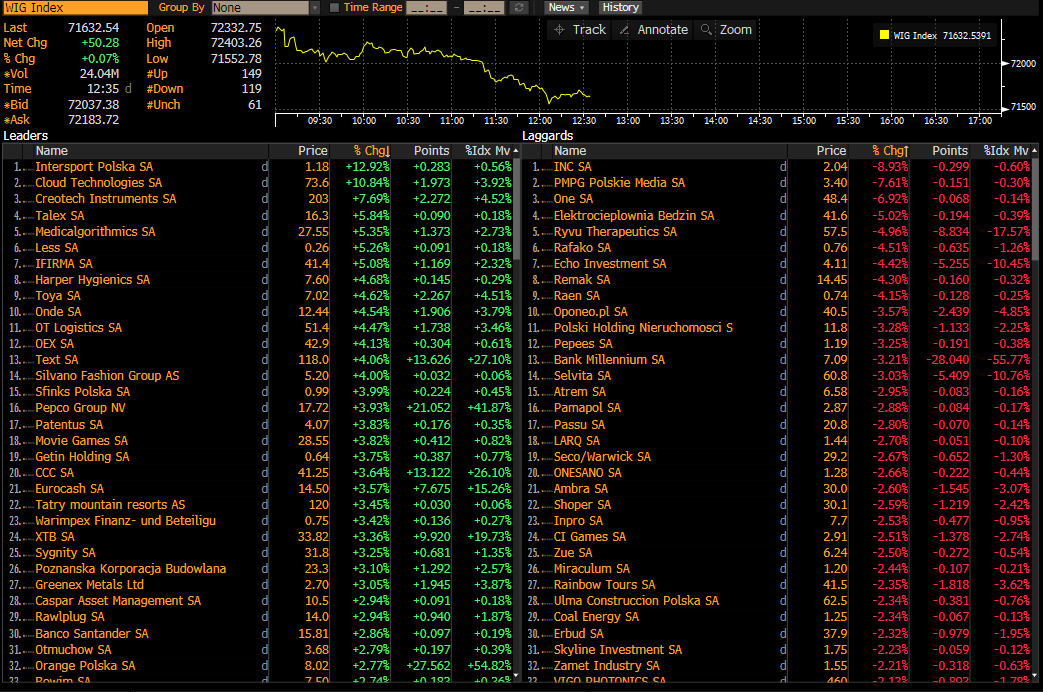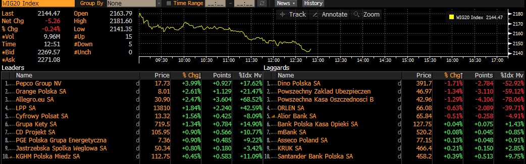 Allegro zyskuje dziś 2,4% a liderem wzrostów wśród WIG20 nieoczekiwanie stało się Pepco. Dużo 'ważące' w głównym benchmarku spółki - Orlen, PKO, PZU oraz Alior notują dziś spadki przyczyniając się do słabszego wyniku indeksu.Źródło: Bloomberg Finance LP