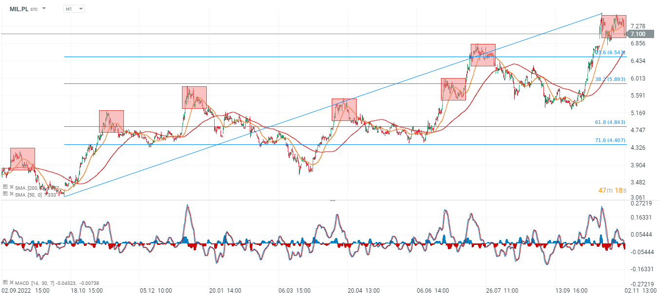 Akcje banku Millenium notują silne spadki po utworzeniu niedźwiedziej formacji podwójnego szczytu w okolicach 7,35 PLN za walor. Najbliższym istotnym wsparciem wydają się poziomy od 6,5 do 7 PLN gdzie możliwy jest scnariusz domknięcia luki oraz testu 23,6 zniesienia Fibonacciego fali wzrostowej z jesieni 2022 roku.