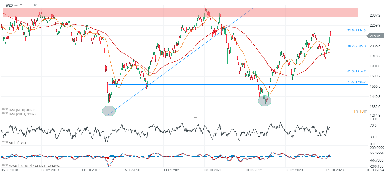 - W20 cofa się w okolice 2155 pkt po sięgnięciu maksimów z lipca 2023 roku i notowany jest zaledwie 0,1% wyżej
