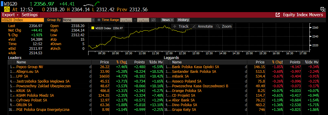 Najmocniejsze wzrosty widoczne sa na akcjach Pepco, co może być związane z rekomendacją ze strony JP Morgan, który widzi wzrost ceny do 31 zł za akcje. Ten sam bank widzi również cenę 20 tys. zł na akcjach LPP. Źródło: Bloomberg Finance LP