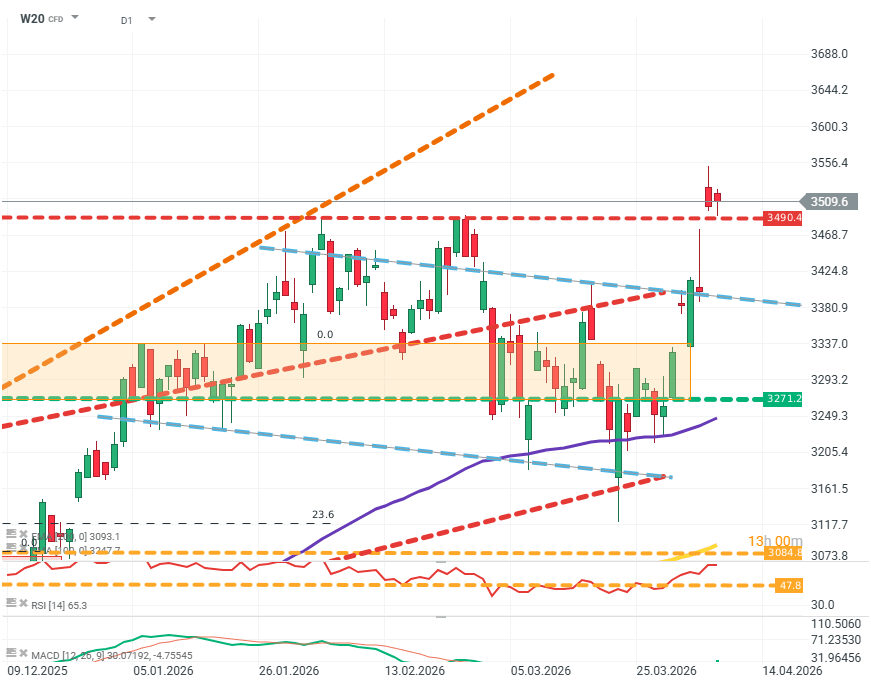 Kurs na wykresie pozostaje powyżej poziomu 3500 punktów. Jest to kluczowy poziom, którego obrona jest istotna dla strony popytowej w celu zachowania inicjatywy i perspektyw na wzrosty. Przełamanie tego poziomu mogłoby otworzyć drogę do linii trendu (niebieskiej) oraz testu poziomu 3380, a następnie kolejnego wsparcia na poziomie 3270 punktów. Źródła: xStation5