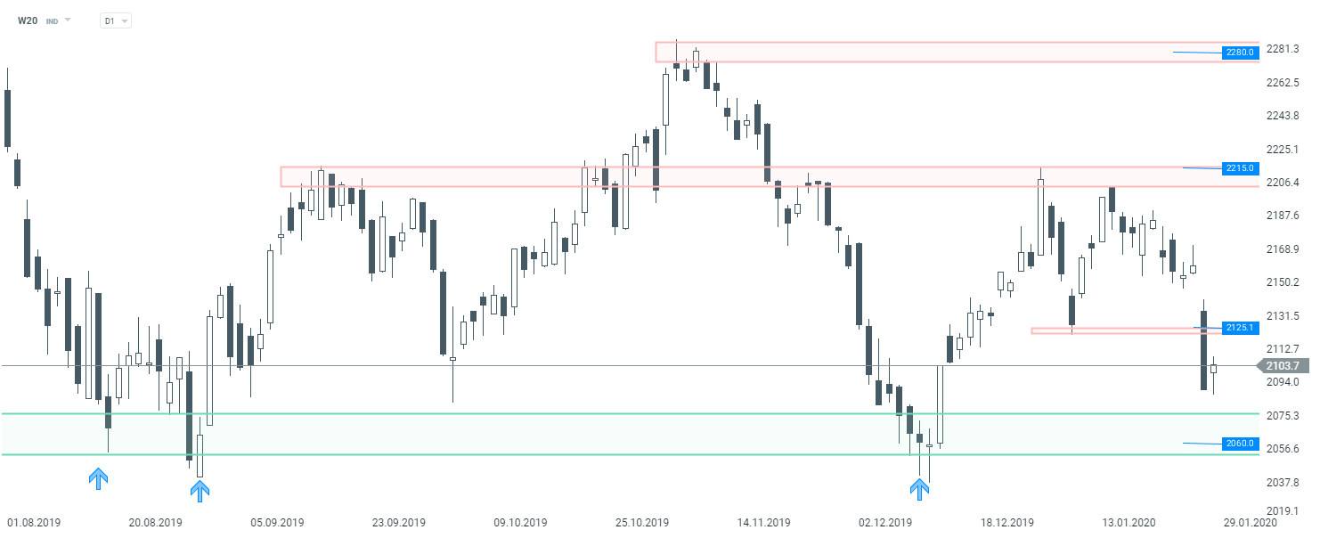 Indeks dwudziestu największych spółek próbuje odrabiać spadki po wczorajszej silnej przecenie. Jednak dopóki kurs znajduje się poniżej poziomu 2125 pkt, istnieje szansa na dalsze spadki. Kluczowym wsparciem jest strefa przy 2060 pkt. W20 interwał D1. Źródło: xStation5