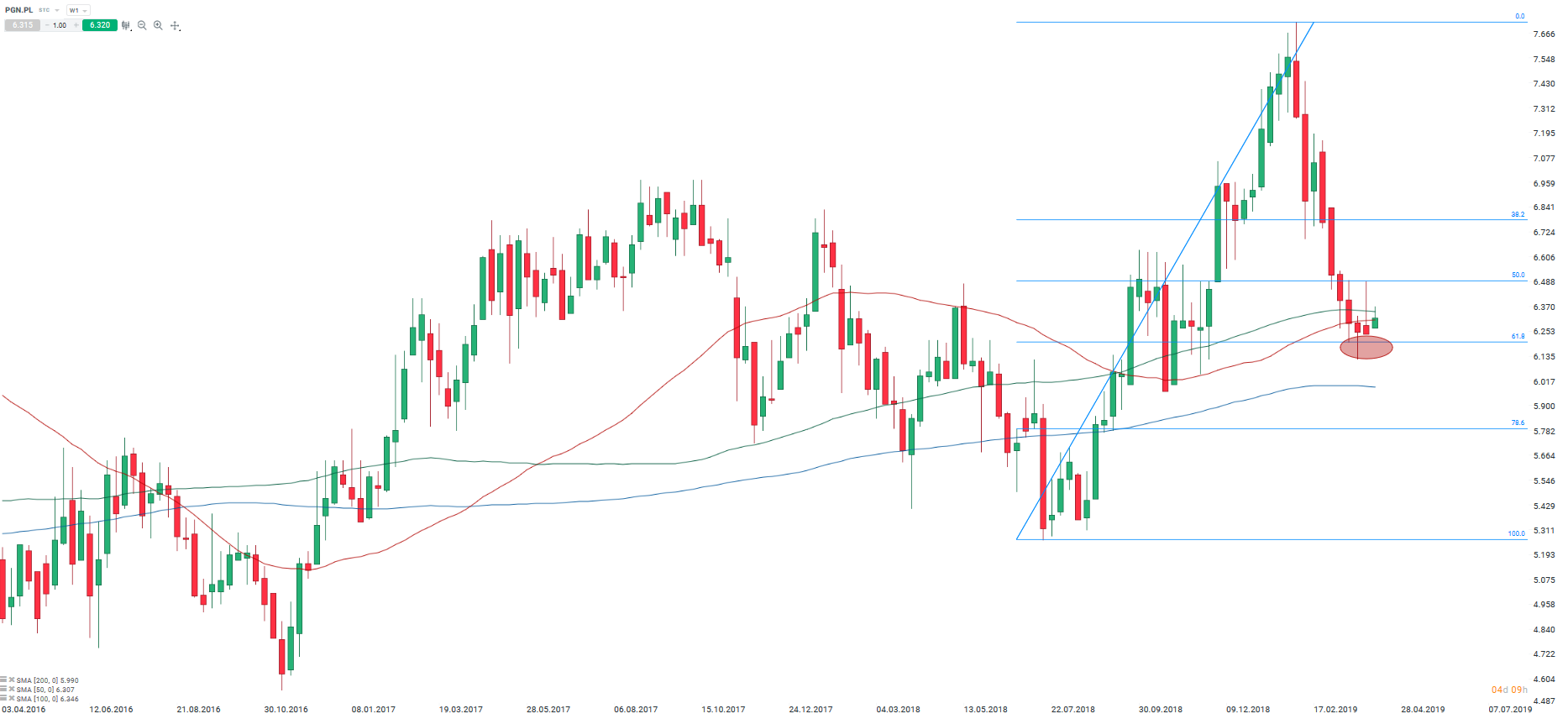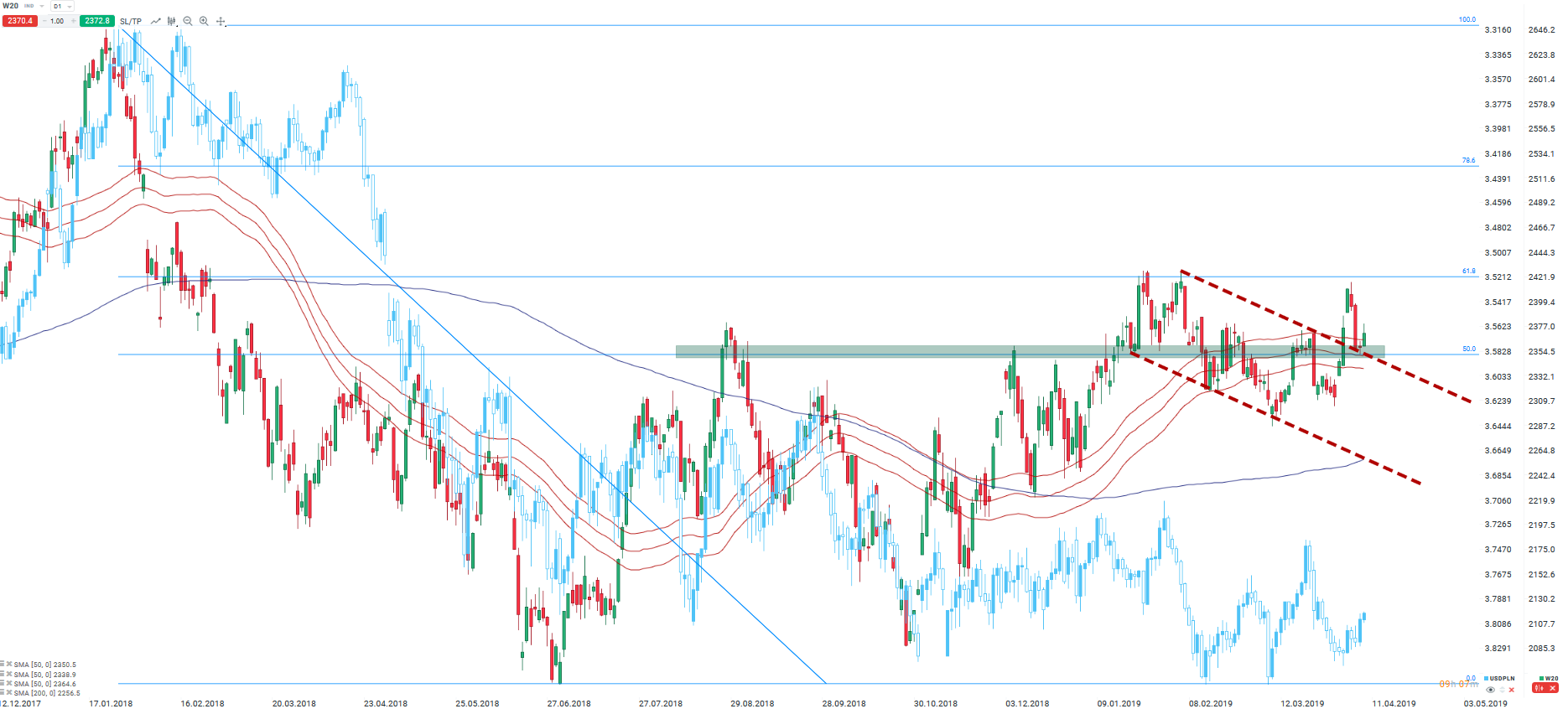 Przecena zatrzymała się w okolicach zniesienia 61,8% fali wzrostowej od I połowy 2018 roku oraz w okolicach średniej 50 i 100-sesyjnej. Źródło: xStation5.