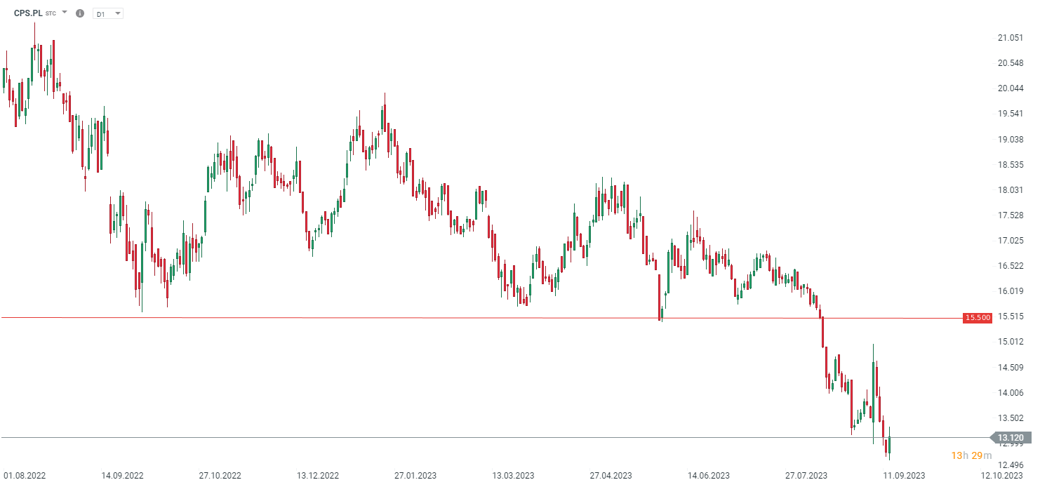 CPS.PS powraca powyżej 13 zł za akcje. Kluczowy opór znajduje się w okolicach 15,5 zł za akcje. Źródło: xStation5