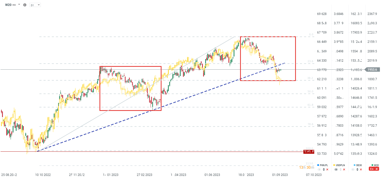 W20 konsoliduje się pomiędzy 1930, a 1955. Konsolidacja ta może sugerować chęć powrotu do trendu spadkowego, na co wskazywałaby dalsza wyprzedaż na USDPLN. Z drugiej strony widać niewielką poprawę nastrojów w Europie i próbę ożywienia na DE30, która mogłaby sprzyjać nastrojom na rynku akcji. Źródło: xStation5