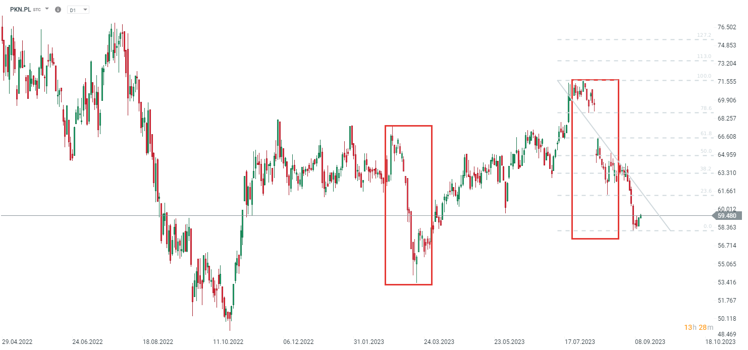 Akcje spółki spadły o niemal 20% od ostatniego szczytu z lipca, choć wliczyć w to trzeba wypłatę dosyć spore dywidendy. Wczoraj doszło do odbicia cen akcji, pierwszy raz od 1 września. Kluczowy opór dla spółki znajduje się w okolicach 61,5 USD za akcje. Jednocześnie warto zaważyć, że spadki zawierają się w zakresie poprzedniej korekty z marca. Z drugiej strony korekta z marca sugeruje, że kluczowa strefa popytu znajduje się dopiero w okolicach 53-55 zł za akcje. Źródło: xStation5