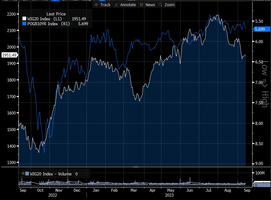 W20 utrzymuje się w konsolidacji i odbija z okolic 1930. Konsolidacja ta sugeruje jedynie przystanek przed powrotem do trendu spadkowego. Jedynie wybicie zniesienia 23.6 (1996) mogłoby oznaczać próbę odwrócenia obecnego trendu. Na PLN mogło dojść wczoraj do interwencji, ale dzisiaj o poranku obserwujemy powrót do słabości złotego. Rentowności obligacji 10 letnich w Polsce rosną dosyć wyraźnie, jedynie dzisiaj o 7 punktów bazowych do poziomów powyżej 5,7%.