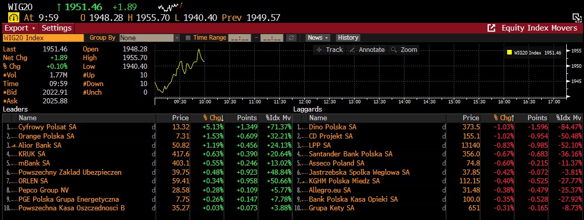 Na godzinę po starcie sesji WIG20 zyskuje 0,1%. Największe wzrosty są widoczne na Cyfrowym Polsacie oraz Orange Polska. Z drugiej strony tracą jedne z większych firm prywatnych czyli Dino, CDR oraz LPP. Źródło: Bloomberg Finance LP