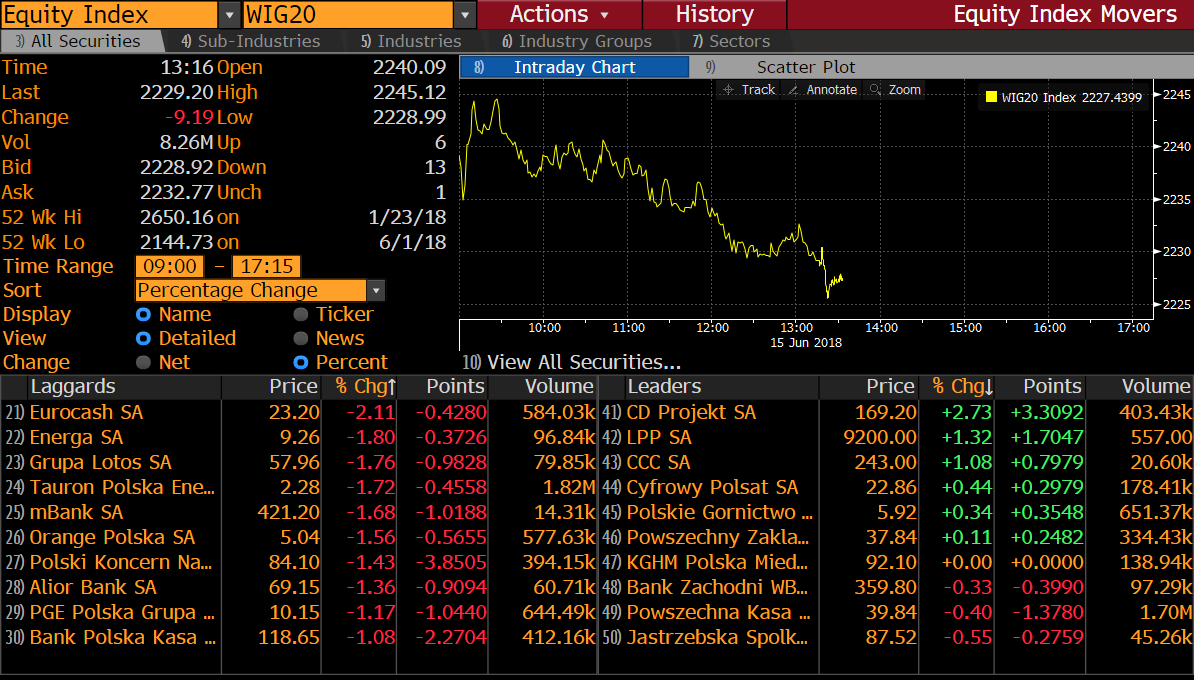W krajobraz spadkowy wpisuje się również polska giełda. Spadki obserwujemy na wszystkich trzech głównych indeksach. Dużą przecenę obserwujemy przede wszystkim na indeksie średnich spółek. Najsłabszym sektorem jest dziś branża energetyczna. Największe wzrosty natomiast notują subindeksy przedsiębiorstw odzieżowych i farmaceutycznych. O godzinie 14:00 opublikowane zostaną dane dotyczące inflacji bazowej w maju. Rynek oczekuje utrzymania się inflacji w ujęciu rocznym na poziomie 0,6%. W przypadku ujęcia m/m konsensus wskazuje na odczyt równy 0% wobec 0,5% w poprzednim miesiącu. Biorąc pod uwagę gołębie nastawienie polskich bankierów centralnych oraz to, że inflacja pozostaje sporo poniżej celu NBP publikacja nie powinna mieć większego wpływu na rynki. O okolicach godziny 13:30 indeks WIG20 traci 0,5%, mWIG40 spadł o ponad 1%, a sWIG80 znajduje się 0,4% pod kreską.
