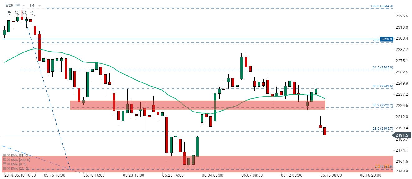Wczorajsze przebicie się powyżej 33-okresowej średniej kroczącej dawało indeksowi W20 nadzieję na dłuższy okres wzrostów. Niemniej jednak, dzisiejsze dużo niższe otwarcie przekreśliło te nadzieje. Indeks znajduje się w okolicy zniesienia 23,6% ostatniego impulsu spadkowego i reakcja na ten poziom może być kluczowa dla dzisiejszej sesji. Jeśli strona podażowa okaże się mocniejsza możemy w najbliższym czasie być świadkami testu strefy wsparcia przy 2160 pkt.