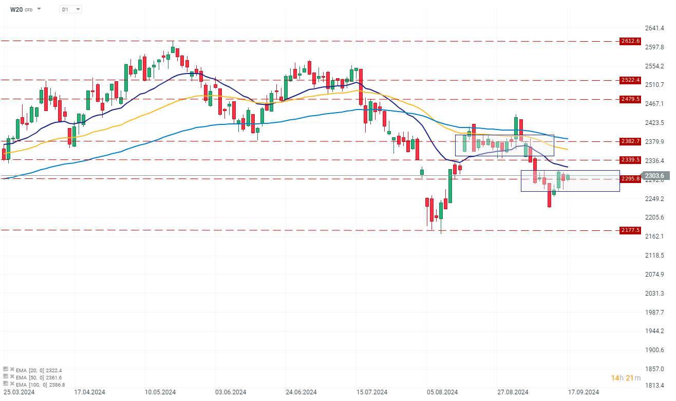 Notowania kontraktu na indeks WIG20 (W20) pozostają na razie w sferze krótkoterminowej konsolidacji w okolicy 2295 pkt. Przebicie tego poziomu stanowi kluczowy sygnał do powrotu do strefy z sierpniowej konsolidacji, jednak na drodze do powrotu do mocniejszych wzrostów kontrakt będzie musiał przebić oporu na poziomie 2340 pkt oraz 2380 pkt. Na razie w krótkim terminie kontrakt nie wykazuje sygnałów ani do mocniejszych spadków ani do wyraźniejszych wzrostów. Podwyższona zmienność może pojawić się pod koniec tygodnia po decyzji Fedu odnośnie stóp procentowych i piątkowego dnia "trzech wiedźm", kiedy wygasają kontrakty terminowe. Źródło: xStation