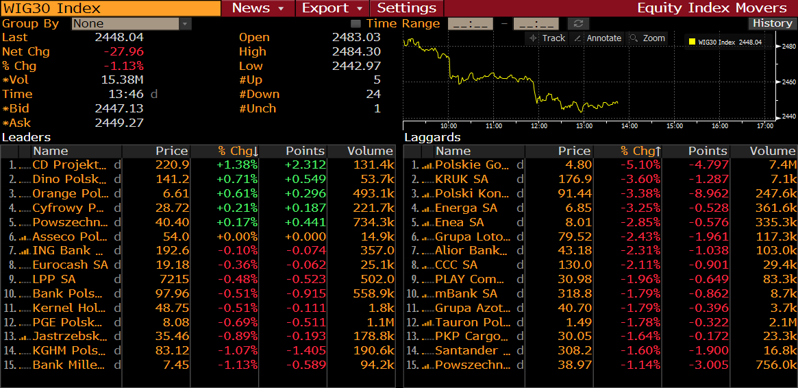 Spółki z indeksu WIG30 o godzinie 13:46. Źródło: Bloomberg