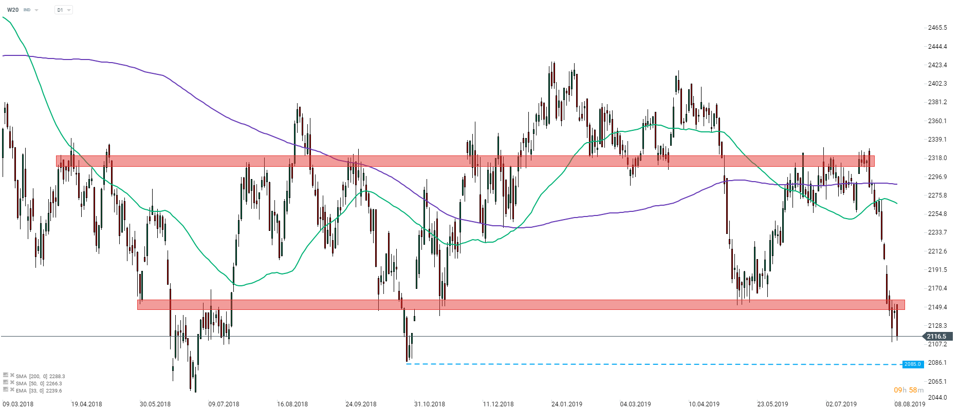 Indeks WIG20 (W20) nie skorzystał na obserwowanej w ostatnich dniach poprawie nastrojów i kontynuuje ruch spadkowy rozpoczęty w drugiej połowie lipca. Cena przebiła się poniżej strefy wsparcia rozciągającej się wokół poziomu 2150 pkt, a siła dzisiejszego ruchu spadkowego sugeruje, że niedźwiedziom jest ciągle mało. Kolejnym potencjalnym wsparcie jest dołek z końcówki października 2018 roku przy poziomie 2085 pkt. Źródło: xStation5
