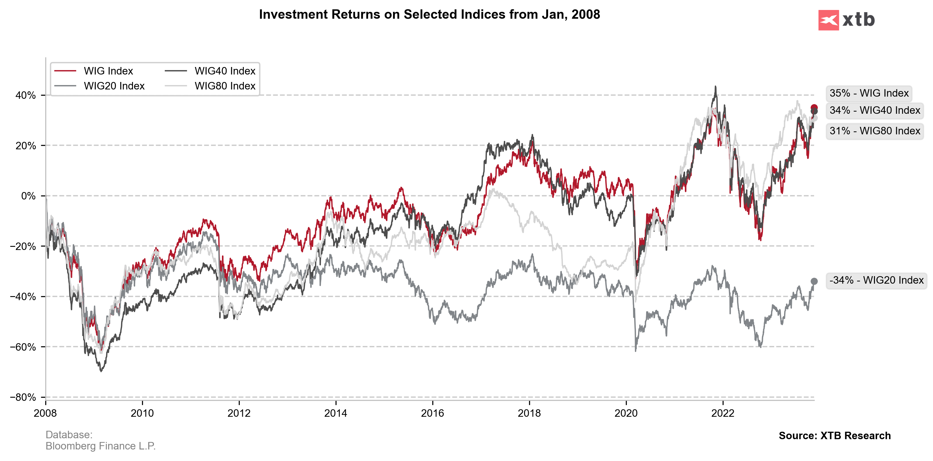 Indeks WIG i inne warszawskie indeksy w ostatnich 15 latach. Źródło: Bloomberg Finance LP, XTB