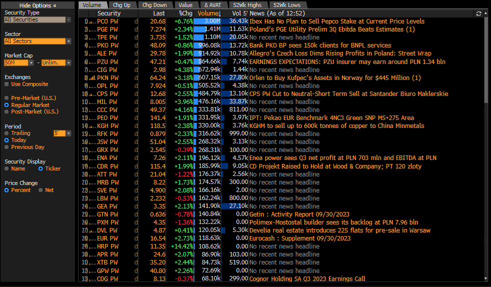 Najmocniej handlowane spółki w indeksie WIG. Źródło: Bloomberg Finance LP