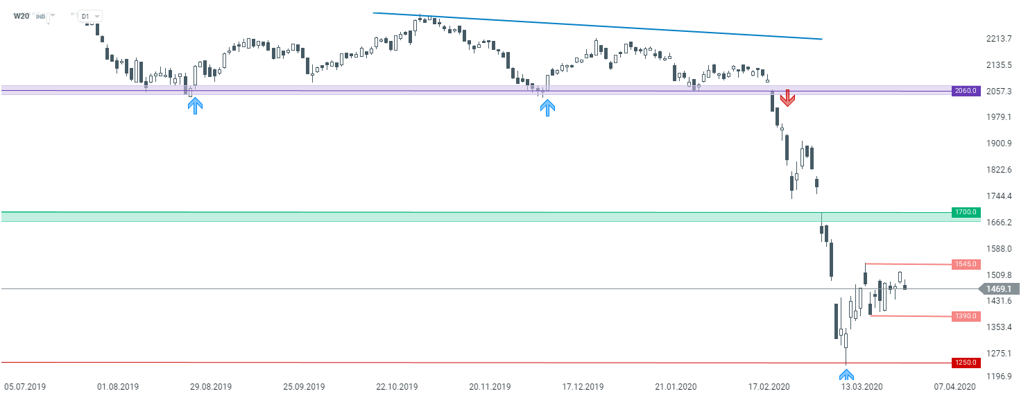 Patrząc z kolei na wykres WIG20 (W20), sytuacja pozostaje bez zmian. Na interwale tygodniowym pojawiła się co prawda formacja zapowiadająca wzrosty, jednak jak widać brakuje kontynuacji ruchu. Schodząc z kolei na niższy przedział czasowy - D1, widać, że kurs utknął w lokalnej konsolidacji pomiędzy 1545 pkt., a 1390 pkt. Przebicie jednego z tych poziomów, może przyczynić się do większego ruchu trendowego.