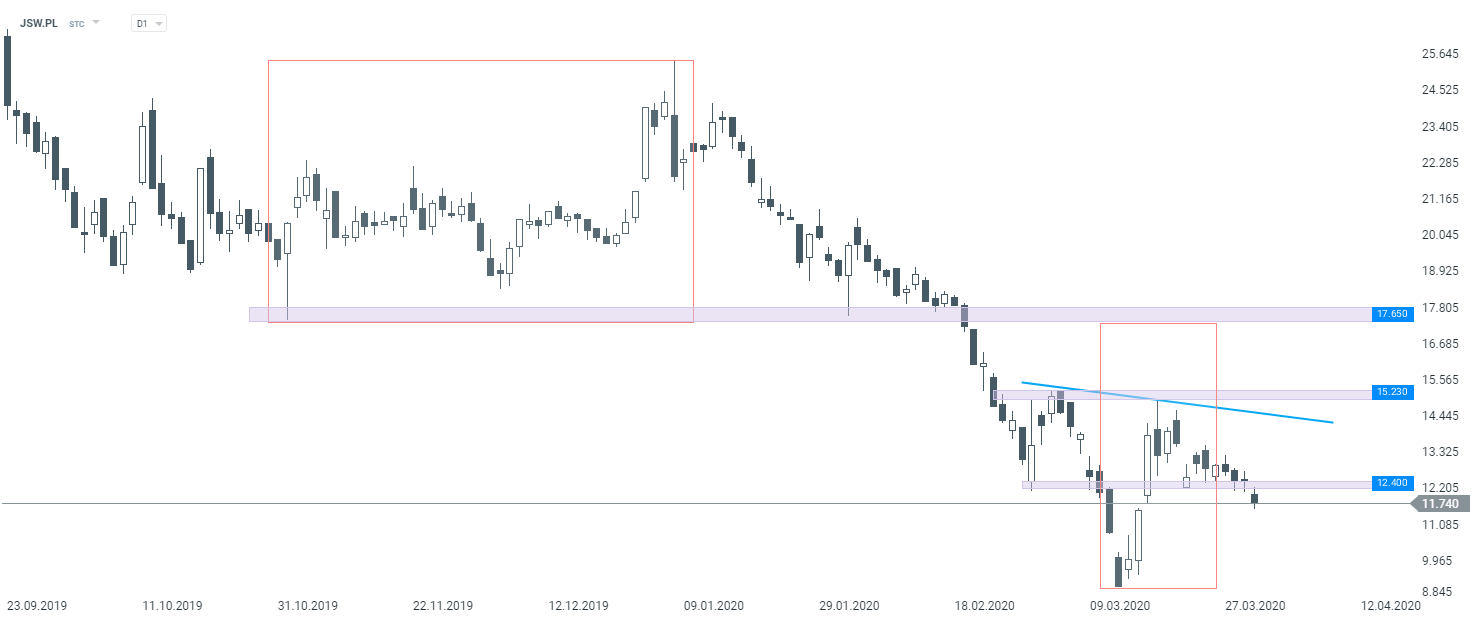 - O wpływie pandemii koronawirusa informuje również Jastrzębska Spółka Węglowa (JSW.PL). Zarząd twierdzi, że podjęto odpowiednie działania wzmacniające bezpieczeństwo pracowników, a także wdrażany jest plan awaryjny, który ma zapewnić ciągłość operacyjną. Zaimplementowano już zmianę organizacji czasu pracy we wszystkich kopalniach oraz wprowadzono trzyzmianowy (zamiast czterozmianowego) system pracy. Pandemią przyczyniła się do tego, że ponad 30% pracowników nie pojawia się obecnie w pracy, co spowodowało spadek produkcji węgla o 40% w ujęciu tygodniowym. Zarząd podkreśla jednak, iż nie stanowi to zagrożenia ze względu na posiadanie istotnych zapasów. Z drugiej strony zaznaczono, że dużym ryzykiem mogą okazać się potencjalne utrudnienia transportu kolejowego lub morskiego. W obecnej chwili nie jest możliwe rzetelne oszacowanie wpływu pandemii na sytuację finansową emitenta.