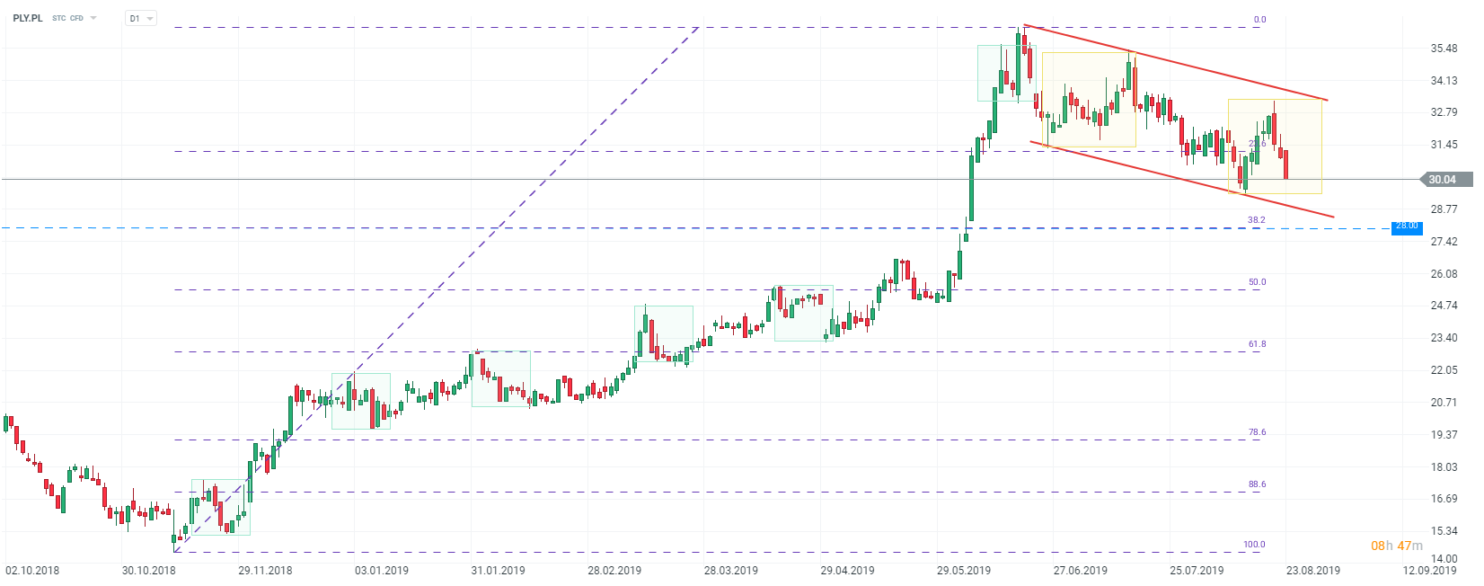 Wyraźnie tracą dziś akcje telekomunikacyjnego giganta - spółki Play. Po godzinie 15:00 spadki wynoszą ponad 3%. Patrząc na wykres nie ma jednak powodów do większych obaw. Kurs znajduje się od połowy czerwca w korekcie spadkowej, główny trend pozostaje jednak wzrostowy. Aktualnie wyznaczać linię po szczytach i dołkach tworzy się kanał spadkowy, w którym porusza się cena. Wybicie górą, powinno zgodnie z założeniami klasycznej analizy technicznej stanowić sygnał do dalszych wzrsotów. Jeśli jednak korekta spadkowa się pogłębi, należy zwrócić uwagę na wsparcie w rejonach współczynnika 38,2% Fibonacciego, gdzie może pojawić się reakcja popytu. Z kolei analizując wykres pod kątem metodologii Overbalance, można zauważyć spadkowy układ (zaznaczony na żółto), który utrzymuje lokalny ruch spadkowy. Dopiero zanegowanie struktury, będzie sygnałem do zakończenia korekty i dalszego ruchu w górę.
