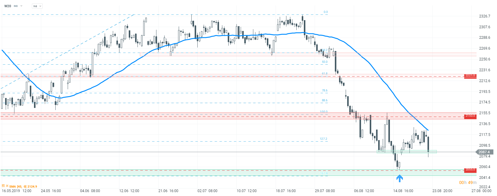 Sytuacja techniczna na W20 nie uległa dużej zmianie od wczorajszej analizy. Po 4 dniach korekty wzrostowej, przyszedł czas na powrót do głównej tendencji, która jest spadkowa. Aktualnie cena próbuje reagować na wysokości lokalnego wsparcia, gdzie rynek odbijał 13 i 20 sierpnia, niemniej pokonanie tego poziomu, powinno się przyczynić do ponownego testu strefy wsparcia przy 2050 pkt. Pamiętajmy, że trend pozostaje spadkowy i dopiero wyjście powyżej bariery przy 2150 pkt mogłoby zmienić scenariusz na wzrostowy. Ponowny wzrost napięć handlowych na pewno nie będzie odbierany pozytywnie w najbliższych dniach, co powinno się przekładać na gorsze nastroje na rynku akcji. Warto mieć także na uwadze dzisiejsze przemówienie prezesa Fed, które rozpocznie się już za niespełna 30 minut.