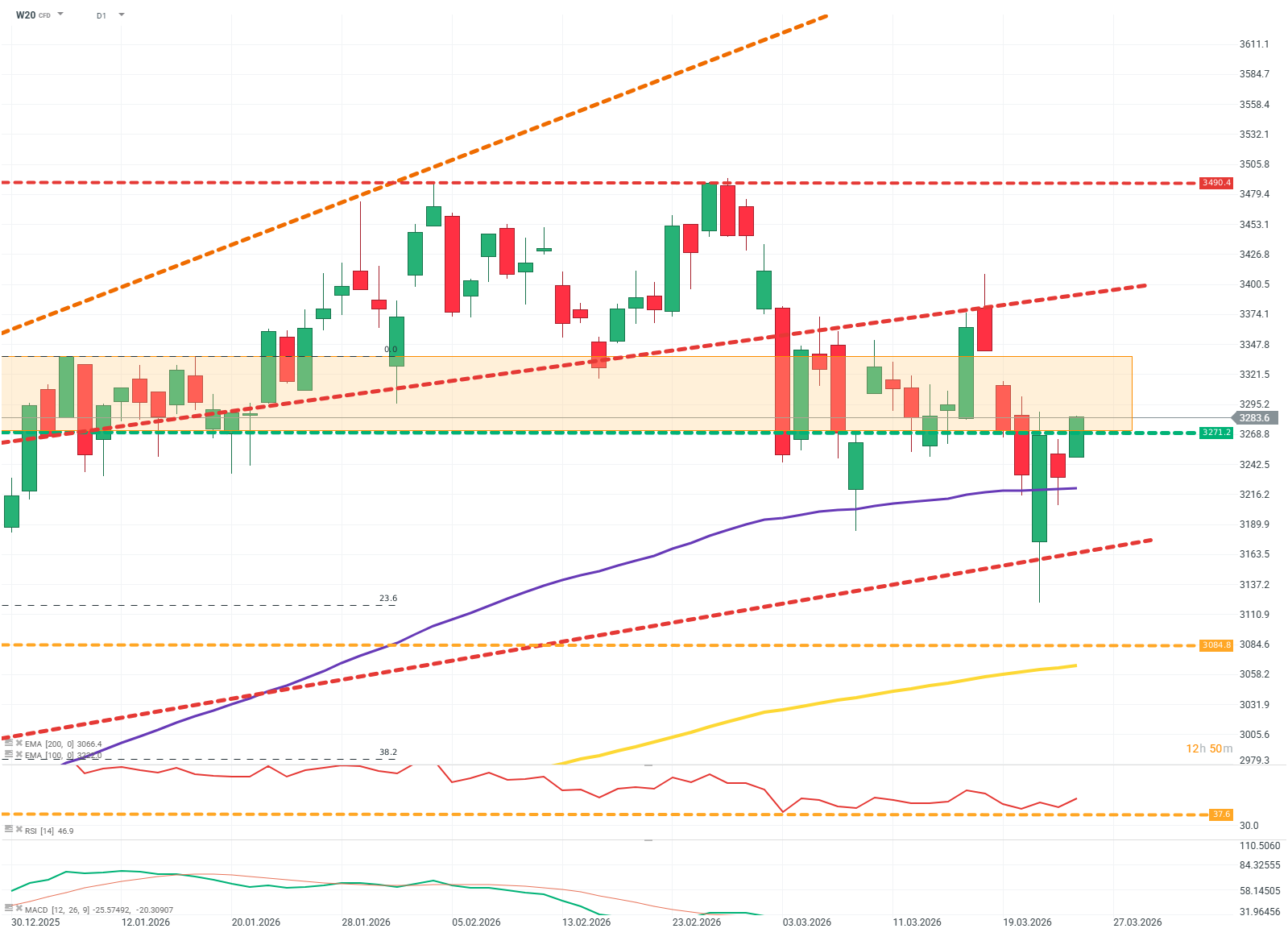 Kupujący wydają się powoli odzyskiwać inicjatywę; popytowi udało się obronić poziomy linii trendu oraz EMA100. Obecnie trwa walka o utrzymanie się powyżej strefy oporu 3270. Wyjście górą ze strefy może dać szansę na powrót do poprzedniego, bardziej stromego trendu wzrostowego. Źródło: xStation5