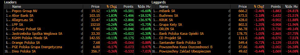 Wśród sektorów na polskim rynku najgorzej na razie radzi sobie budownictwo. Notowania WIG-BUDOWNICTWO spadają o -1,28%. Liderem spadków w sektorze jest Mostostal Płock, które traci -5,88% po opublikowaniu szacunków dotyczących wyników za 2023 r.