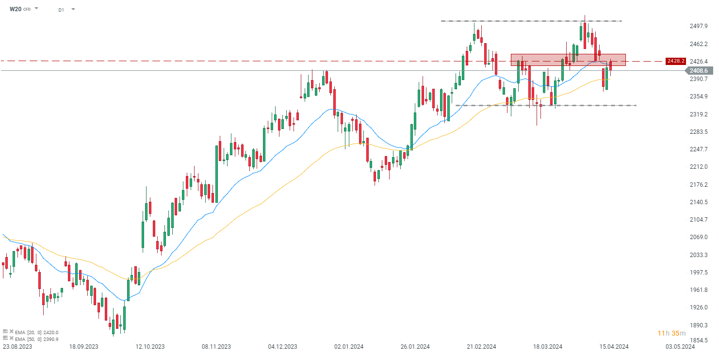 Kontrakt na indeks WIG20 (W20) prezentuje w średnim horyzoncie na razie wciąż trwające neutralne podejście do rynku jakie widać u inwestorów. Brak jasnych sygnałów podażowych nie stwarza powodów do spadku poniżej granicy kanału trendu bocznego, w jakim kontrakt znajduje się od końca lutego. Korekta z początku tygodnia została wczoraj nadrobiona, a obecnie rynkowi brakuje siły by przebić lukę cenową utworzoną po wtorkowych notowaniach. Przy pozytywnych sygnałach z zagranicznych rynków można się spodziewać, że tendencja się odwróci i może dojść do zamknięcia luki, jendakże obecne nastroje inwestorów na to nie wskazują. Dodatkowym ograniczeniem wydaje się opór na poziomie 2428,2 pkt, ktktóego prezbicie z początku kwietnia nie utrzymało się w kolejnych tygodniach. Źródło: xStation