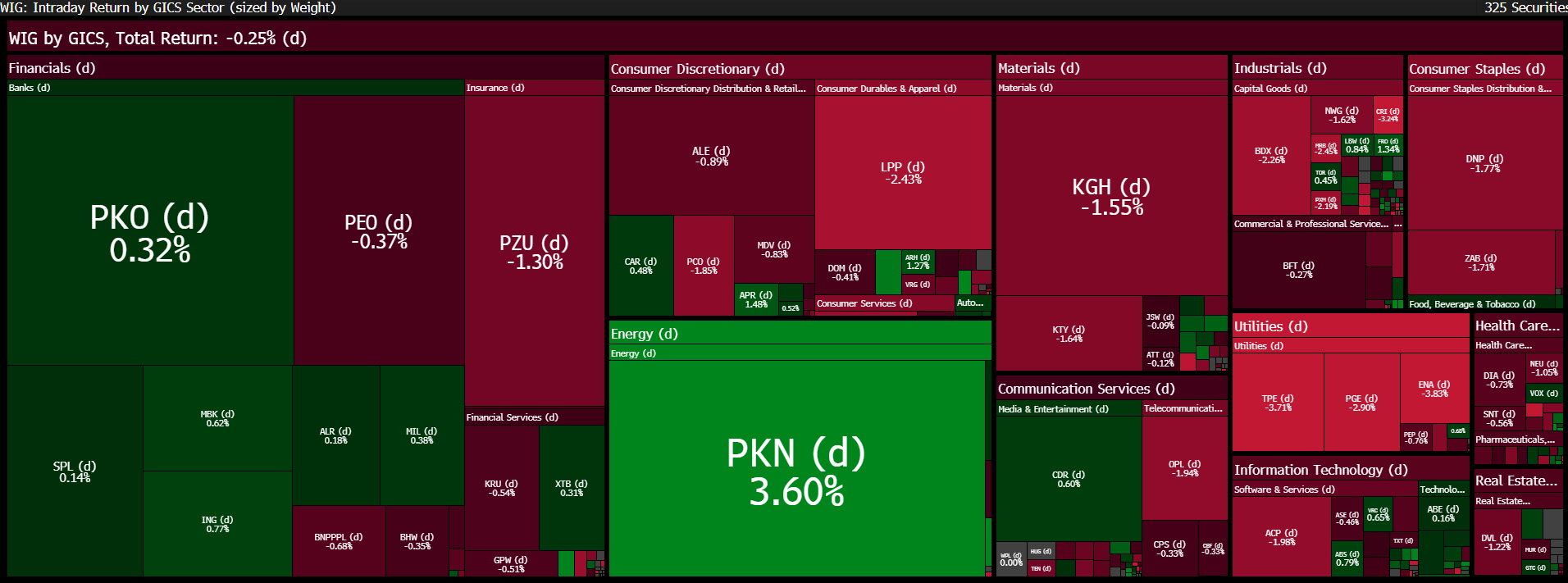 Widać to również na krajowym rynku akcji, gdzie indeksy tracą pod wpływem globalnej niepewności. Na godzinę 12:00 WIG spada o 0,2%, WIG20 o 0,1%, mWIG40 o 0,6%, a sWIG80 o 0,1%. Sytuacja ta pokazuje, że inwestorzy pozostają ostrożni i wyczekują jakichkolwiek sygnałów stabilizacji na arenie międzynarodowej, które mogłyby uspokoić rynki i przywrócić większą aktywność zakupową.