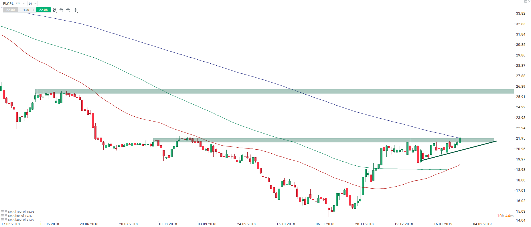Ciekawą technicznie spółką w indeksie MWIG40 jest Play (PLY.PL). Notowania spółki dzisiaj wychodzą górą z budowanej od kilku tygodni konsolidacji, a byki atakują średnią 200-sesyjną. Od dołka w listopadzie Play zyskał już ponad 50%. Jeżeli ten poziom zostanie wybity, to z perspektywy wykresu dziennego kolejnym potencjalnym oporem są dopiero okolice 26,5 złotego.