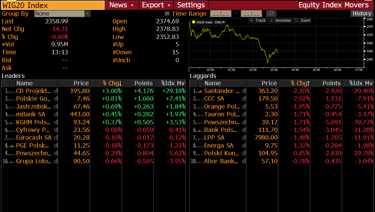 Dzisiejsza sesja w Europie ma mieszany charakter, a na tablicy notowań ciężko zaobserwować wyraźny kierunek. Niemiecki DAX (DE30) około 13:00 spada o około 0,4%, a londyński FTSE100 (UK100) rośnie około 1,5%. W Polsce blue chipy radzą sobie dzisiaj gorzej, a indeks WIG20 (W20) traci około 0,6%. Jedynym głównym indeksem, który zyskuje jest dzisiaj SWIG80.