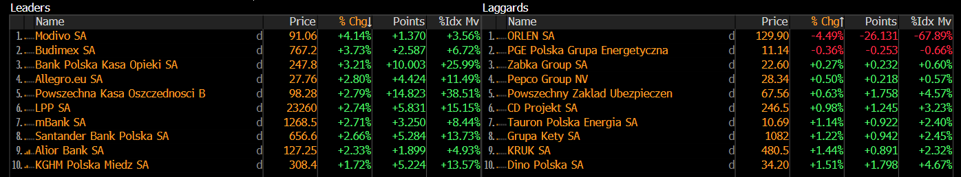 Orlen(PKN.PL) należy dziś do najsłabszych komponentów indeksu, co można wiązać z pogorszeniem krótkoterminowego sentymentu do sektora paliwowego oraz korektą po wcześniejszych wzrostach. Dodatkowo na notowania wpływają oczekiwania dotyczące niższych cen paliw i ich potencjalnego przełożenia na marże, przy jednoczesnej utrzymującej się niepewności regulacyjnej.
