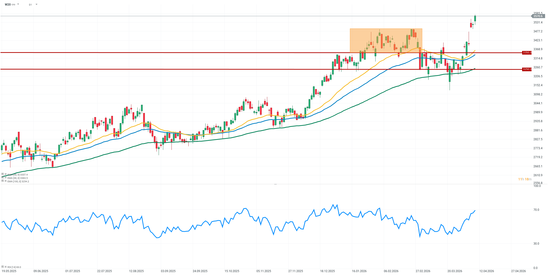 Podczas dzisiejszej sesji kontrakty na WIG20 (W20) wyraźnie zyskują na wartości. Stronie popytowej sprzyjają doniesienia o rozmowach pokojowych na Bliskim Wschodzie oraz spadek cen ropy naftowej. Oczekiwania związane z deeskalacją napięć geopolitycznych i potencjalnym hamowaniem presji inflacyjnej wspierają kupujących, którzy próbują kontynuować odbudować trend wzrostowy rozpoczęty na początku roku.