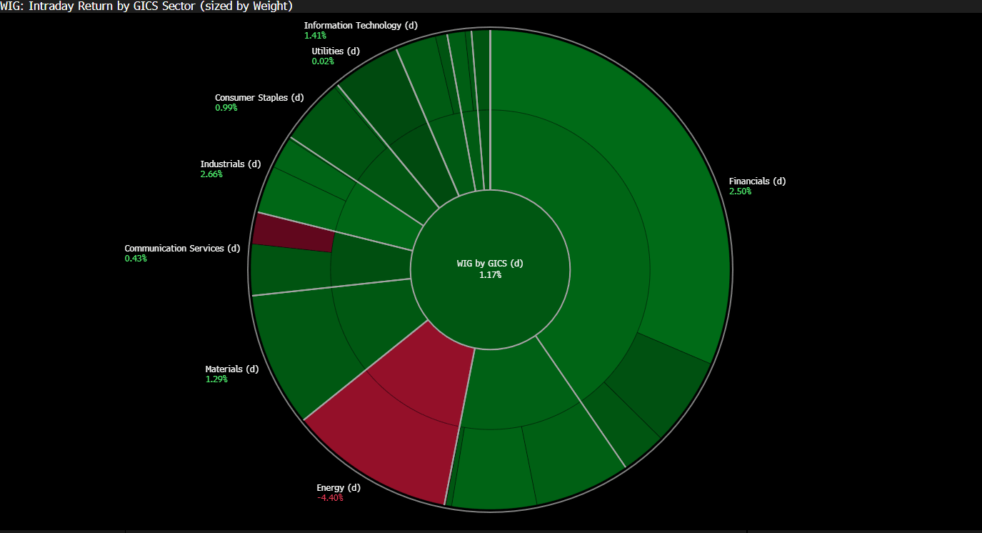 Ostatnia sesja tego tygodnia przebiega w wyjątkowowo pozytywnym otoczeniu. Wśród inwestorów rosną nadzieje na faktyczne uspokojenie sytuacji na Bliskim Wschodzie, co przekłada się na częściowy powrót optymizmu na rynki finansowe. Na godzinę 12:45 szeroki indeks WIG, podobnie jak WIG20, zyskuje około 1%. Indeks mWIG40 rośnie o 1,5%, natomiast sWIG80 znajduje się na poziomie wyższym o 0,6%.