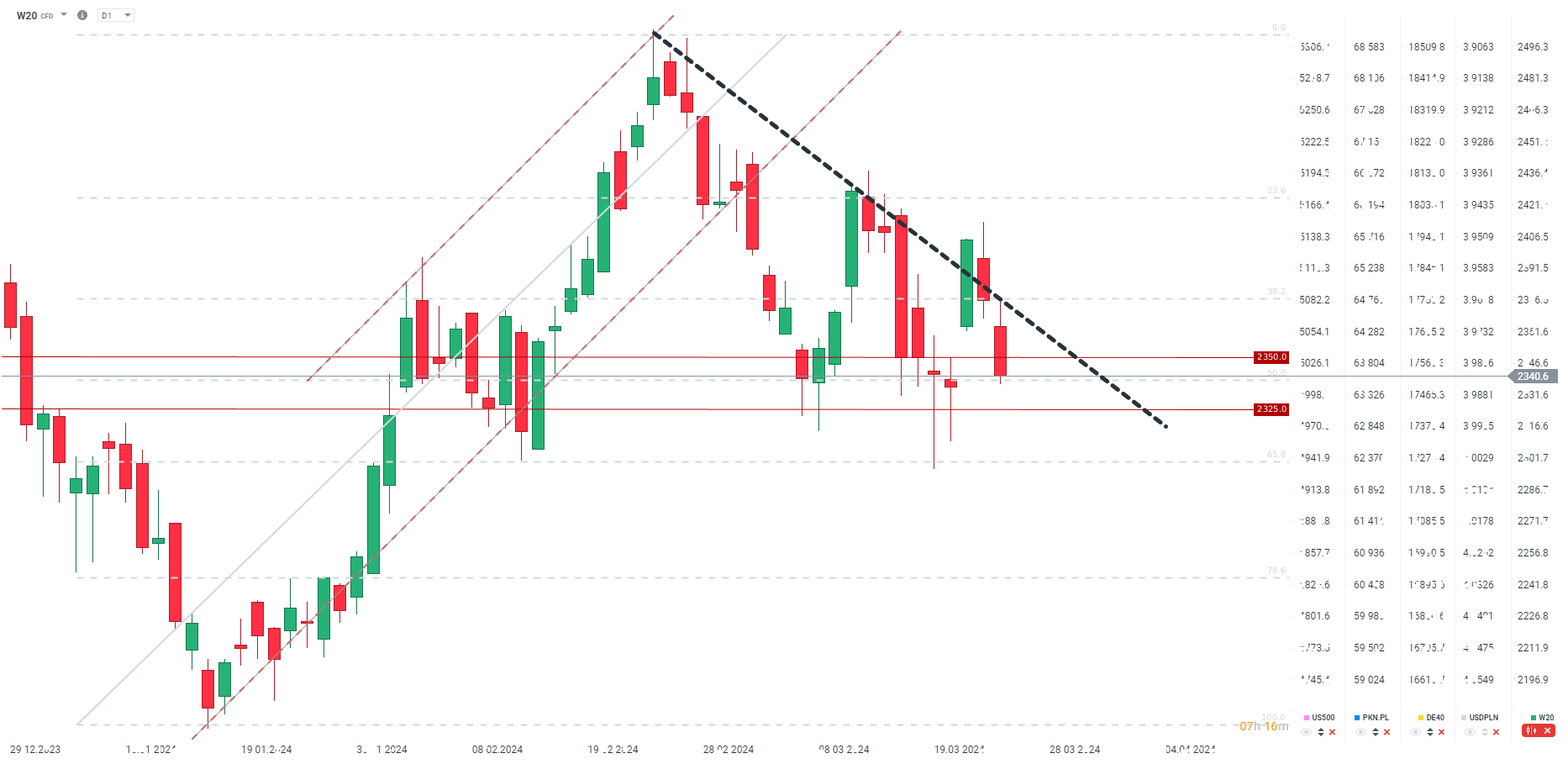 Kontrakt W20 traci mocno na otwarciu ostatniego tygodnia marca i kwartału. Trend wzrostowy został naruszony w zeszłym tygodniu, ale później doszło do wyraźnego odwrotu. Jednocześnie W20 testuje obecnie zniesienie 50.0, bardzo ważne wsparcie. Strefa popytowa jest jednak szersza i ważnym poziomem są okolice 2325 oraz 2300 punktów przy zniesieniu 61.8. Słabość W20 można wiązać też z ostatnią słabością polskiego złotego.