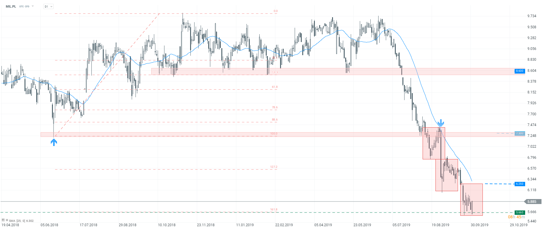 Jeśli chodzi o sytuację na poszczególnych spółkach, warto przyjrzeć się temu co dzieje się na akcjach Millenium Banku. Kurs rośnie dziś ponad 3%, niemniej patrząc na wykres sytuacja wcale nie wygląda dobrze. Co prawda rynek broni współczynnika 161,8% Fibonacciego, niemniej od drugiej połowy czerwca kurs znajduje się w silnej fali spadkowej. Korekta jest co prawda możliwa w każdej chwili jednak należy się wstrzymać z przesadną euforią. Technicznie istnieje miejsce do wzrostów w okolice poziomu 6,25 zł, gdzie wypada górne ograniczenie struktury Overbalance, poziom zbiega się mniej więcej ze średnią SMA 25, na którą rynek reagował pod koniec sierpnia. Dopóki cena nie pokona wspomnianego poziomu 6,25 zł, dalsze spadki wydają się tylko kwestią czasu, trend pozostaje zniżkujący. Dzisiejszy ruch w górę może być spowodowany informacją o sformalizowania połączenia spółki z Euro Bankiem, fuzja została wpisana do KRS. Bank podtrzymał także cel osiągnięcia rocznego zysku netto na poziomie 1 mld zł w okresie 1-2 lat. W przypadku sektora bankowego zmienność na pewno zwiększy się pod koniec tygodnia. W czwartek o godzinie 9:30 poznamy wyczekiwany wyrok TSUE, który określi stosunek co do kredytów frankowych.