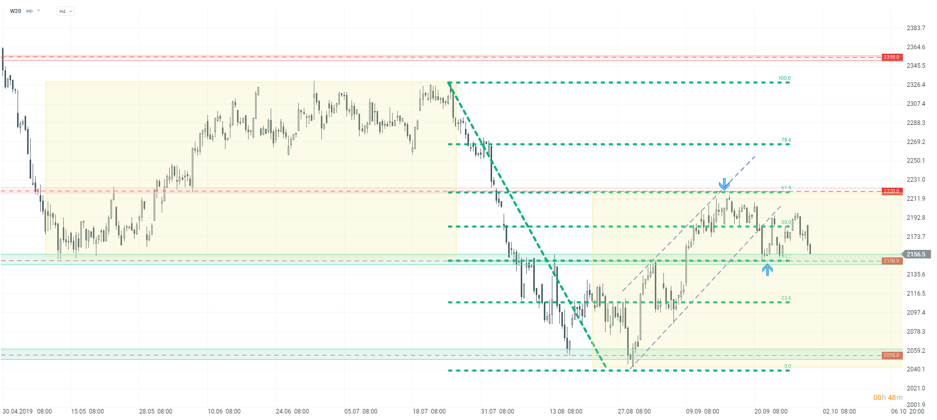W20 ponownie zbliża się do strefy wsparcia przy poziomie 2150 pkt, na który zwracamy uwagę już kolejną sesję z rzędu. W ostatnim czasie kurs wpadł w konsolidację właśnie pomiędzy 2150 pkt, a 2220 pkt, cierpliwie czekamy na wybicie. Wcześniejsze odbicie od górnego ograniczenia układu Overbalance, oraz wybicie dołem kanału wzrostowego, może wskazywać na przewagę sprzedających.