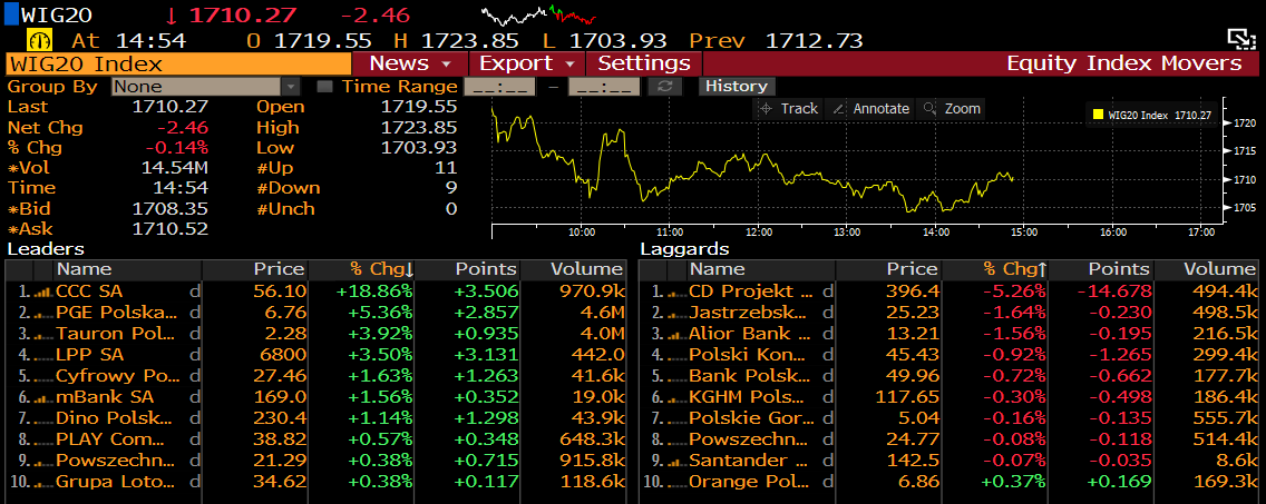 Podczas dzisiejszej sesji możemy obserwować mieszane nastroje rynku akcji. Co prawda główne parkiety w Europie znajdują się na plusie, jednak brakuje zdecydowanego kierunku, indeksy trzeci dzień z rzędu poruszają się w ramach konsolidacji. Sytuacja wygląda zupełnie inaczej w USA, gdzie po wczorajszych wzrostach, rynek kontraktów wskazuje na dalszą zwyżkę, z kolei zamieszanie wokół tematu Brexitu skutecznie stopuje dalszą zwyżkę na indeksach w Europie. Patrząc na nasz polski parkiet, indeks WIG20 radzi sobie najgorzej na tle naszych zagranicznych sąsiadów i traci 0,2%. Wśród największych spółek najmocniej tracą akcje CD Projekt, gdzie przecena przekracza 5%. Z kolei na CCC możemy obserwować solidne ponad 18% wzrosty.